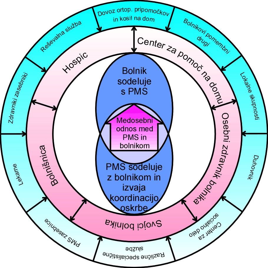 Shema prikazuje koordinacijo zdravstvene nege in oskrbe v domačem okolju pri paliativnem bolniku (Vrtovec, 2009b):