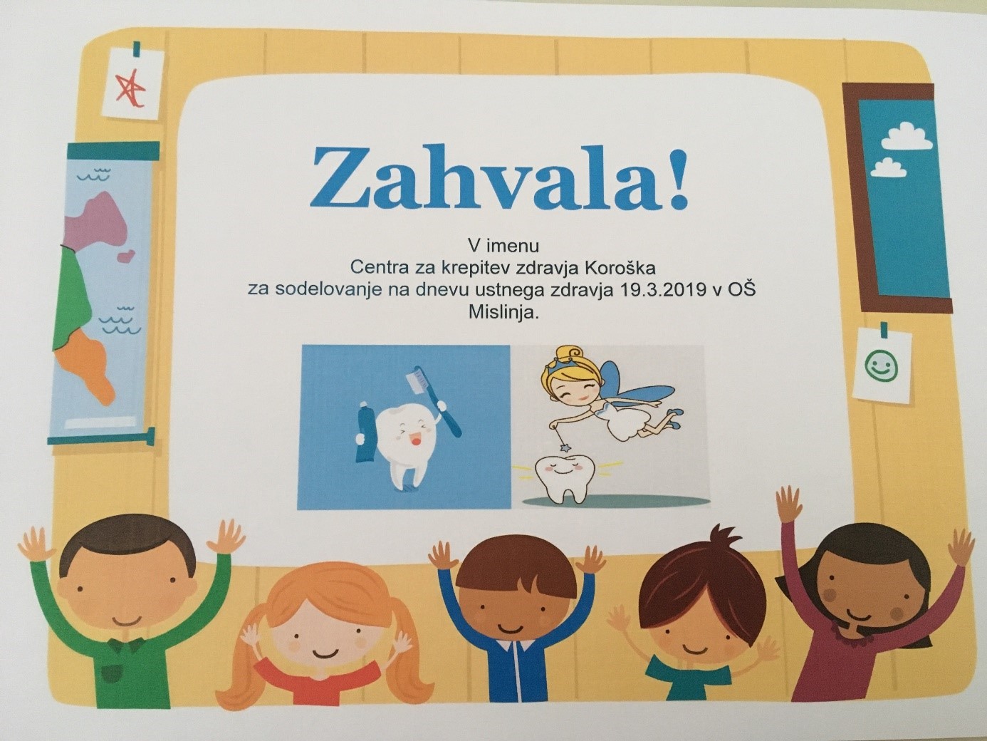 V okviru Svetovnega dneva ustnega zdravja smo za učence prve trijade OŠ Mislinja, dne 19. 3. 2019 od 8.20 €“ 11.05 pripravili poučne delavnice. Na dogodku so otrokom zobozdravnica, ter diplomirane medicinske sestre v sodelovanju z dijaki Srednje zdravstvene šole predstavile pravilno tehniko umivanja zob, zdravo prehrano za zdrave zobe in dlesni, nitkanje zob in ukrepe ob poškodbah zob. Dan je potekal sproščeno, poučno, plesno zabavno.