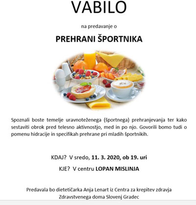 V sredo, 11. 3., vas ob 19. uri vabimo na predavanje o prehrani športnika.