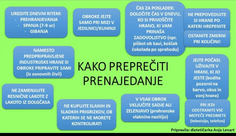 Dietetičarka CKZ Koroška Anja Lenart je pripravila priporočila Kako preprečiti prenajedanje v času, ko je zaradi epidemije koronavirusa treba ostati doma in je želja po hrani pogosto večja od dejanskih potreb.