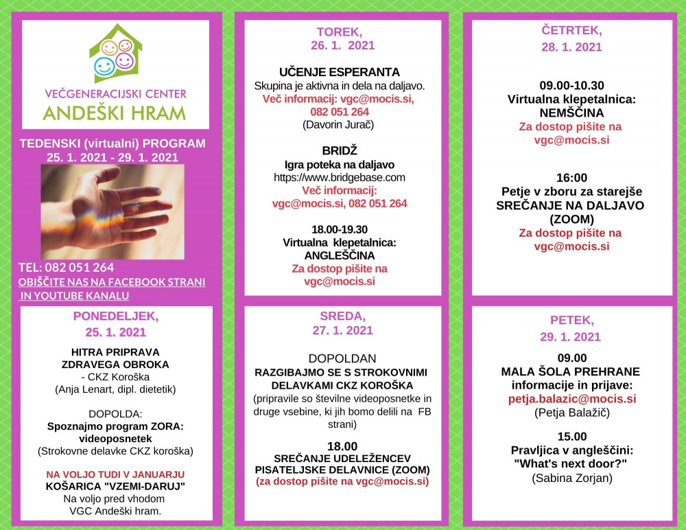 Poleg programa sproti pripravljamo še druge delavnice, videoposnetke, kvize ipd., kar objavljamo na naši Facebook strani in na YouTube kanalu: https://www.youtube.com/channel/UC25qnDhdPLFlMSAqJ1gzwzg.