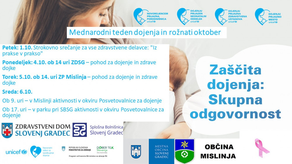 Ob letošnjem mednarodnem tednu dojenja in v okviru rožnatega oktobra bomo v Zdravstvenem domu Slovenj Gradec v sodelovanju s Splošno bolnišnico Slovenj Gradec in tamkajšnjo porodnišnico in Oddelkom za pediatrijo ter MO Slovenj Gradec in občino Mislinja pripravili nekaj aktivnosti: