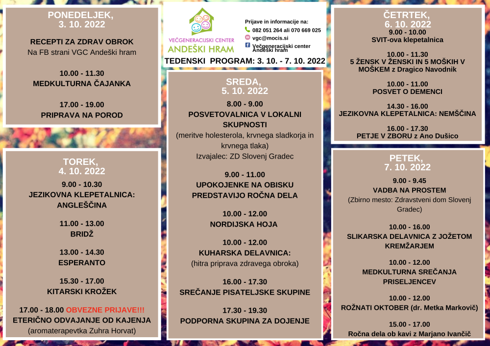 Tedenski spored VGC Andeški hram 3.10. - 7.10.2022