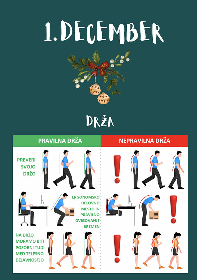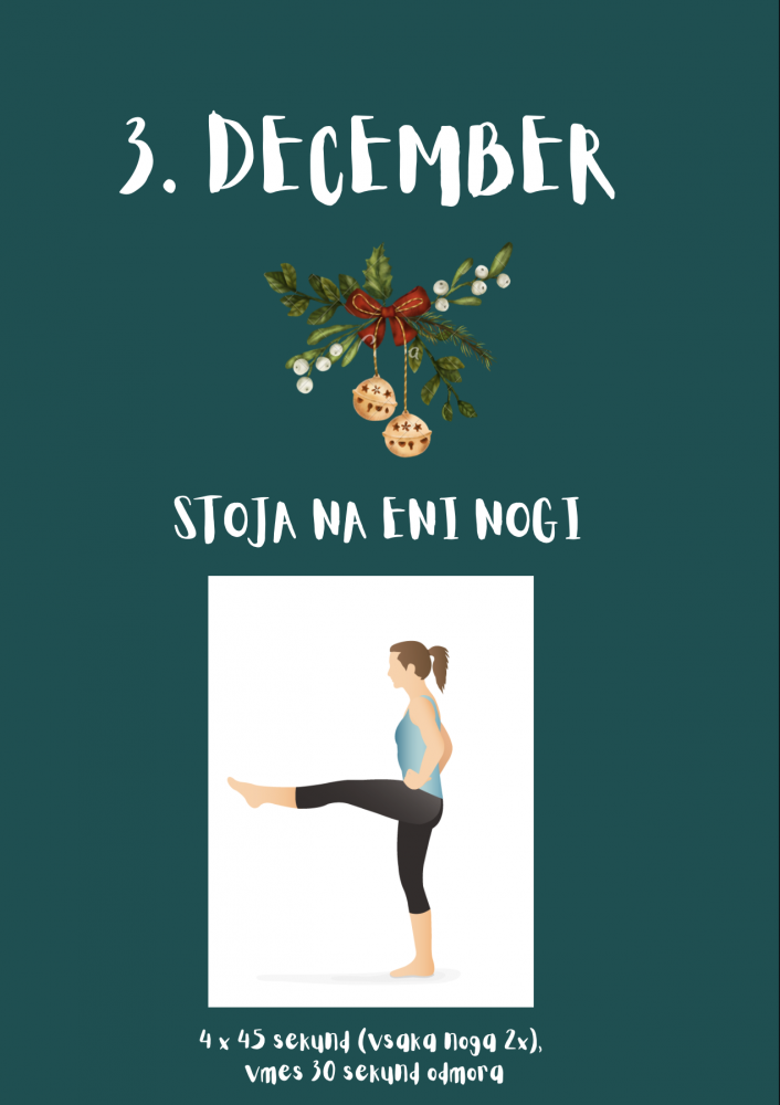 Danes je na vrsti ravnotežna naloga €“ stoja na eni nogi. Težo prenesite na eno nogo, drugo nogo dvignite rahlo od tal (v višino gležnja), tako da pokrčite koleno. Stojte na eni nogi kolikor dolgo lahko, največ 45 sekund. Naredite 4 ponovitve €“ z vsako nogo 2 €“ krat. Vmes si vzemite 30 sekund odmora.