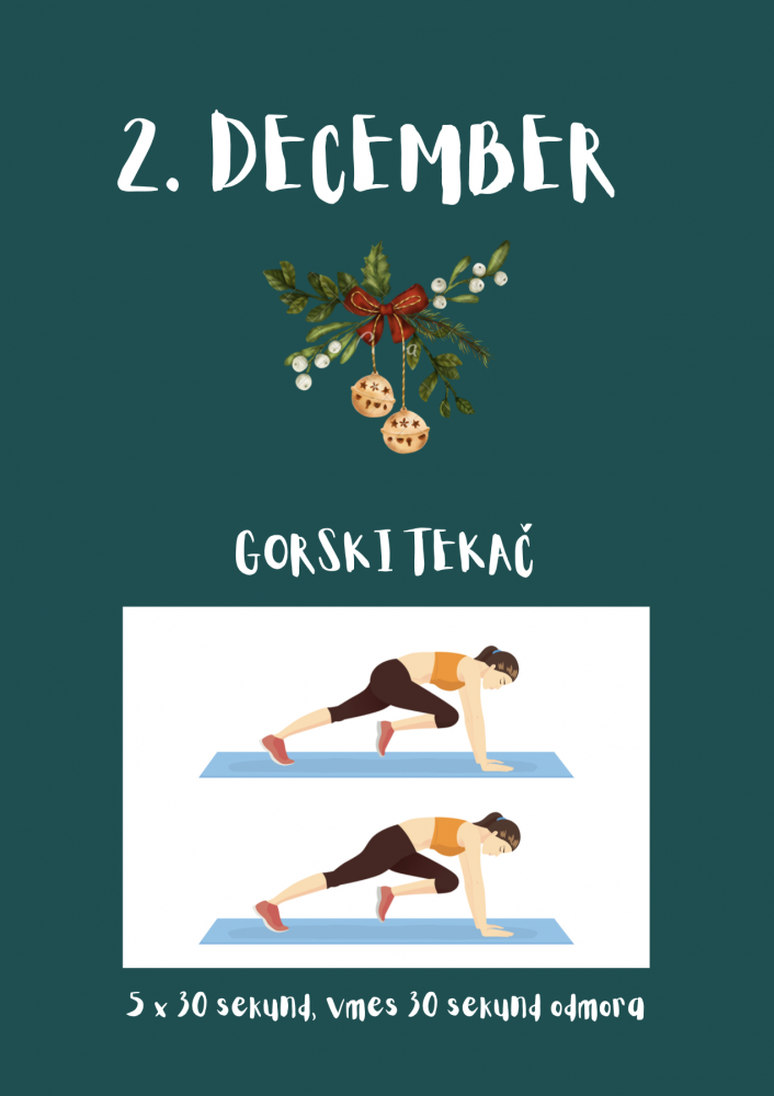 Pred vami je prva gibalna naloga €“ gorski tekač. Postavite se v položaj na vse štiri tako, da so noge iztegnjene nazaj. Pazite, da imate zapestja pod rameni. Izmenično krčite kolena proti prsnemu košu, tako kot bi tekli. Vajo izvajajte 30 sekund in naredite 5 ponovitev. Med ponovitvami si vzemite 30 sekund odmora.