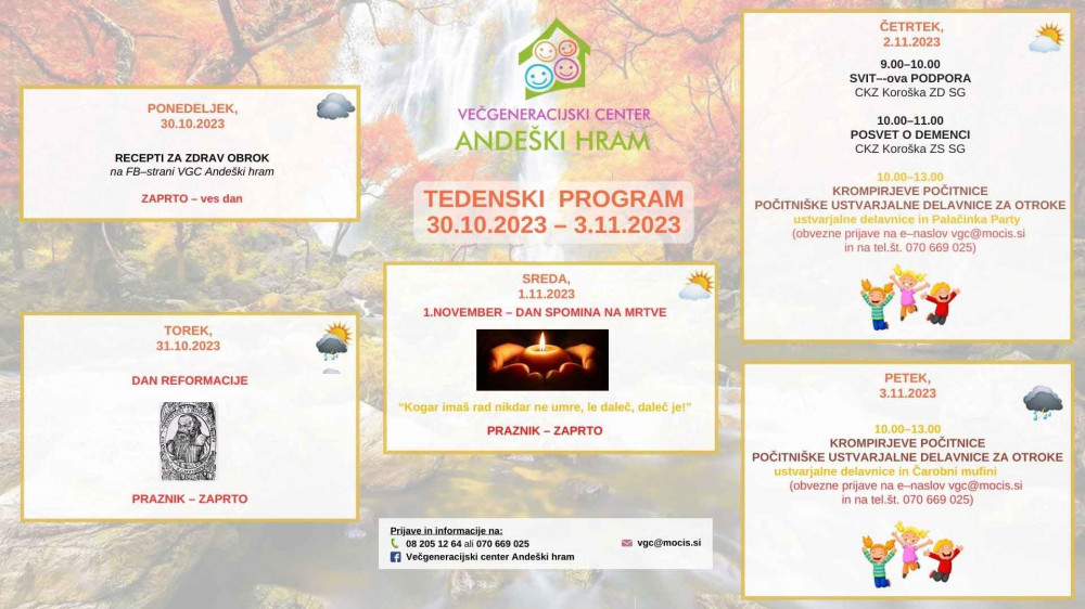 TEDENSKI PROGRAM VGC ANDEŠKI HRAM od 30.10.2023 do 3.11.2023