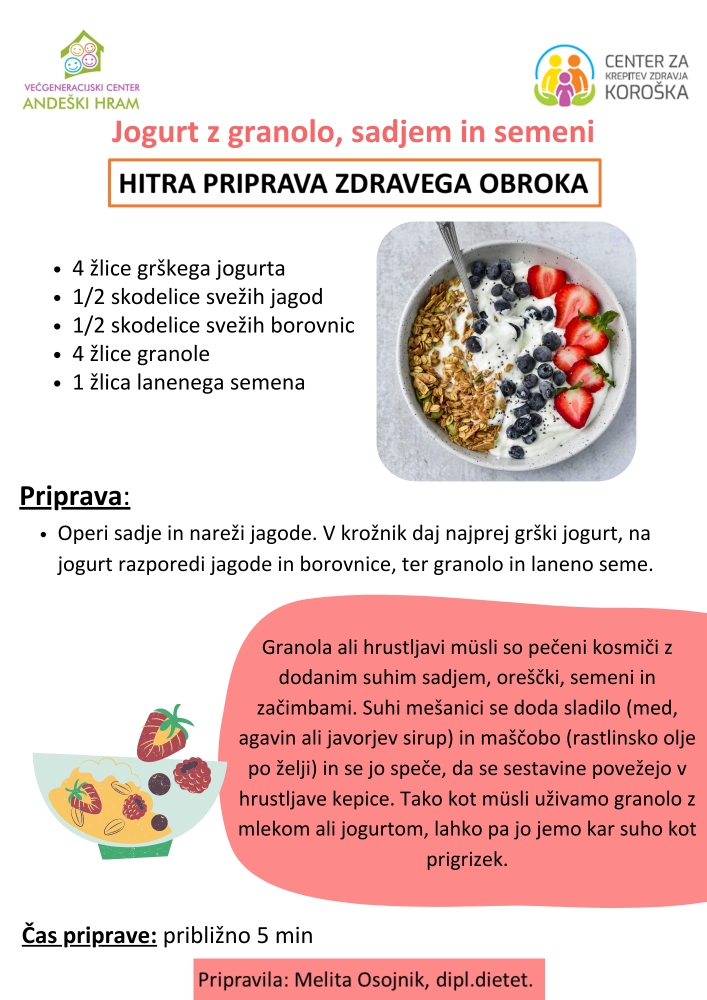 Jogurt z granolo, sadjem in semeni