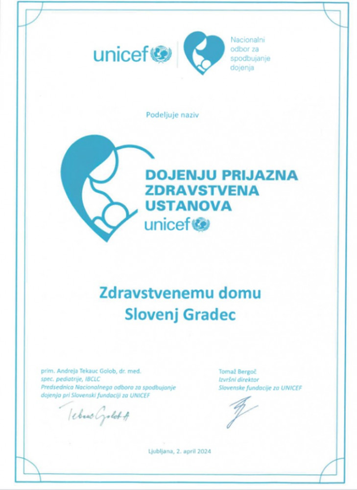 Zdravstveni dom Slovenj Gradec je prejel častni naziv - dojenju prijazna zdravstvena ustanova.